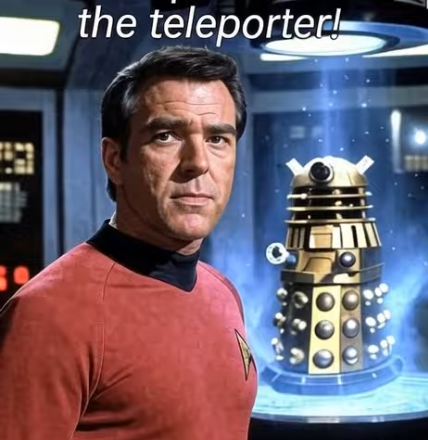 Captain, we've got a right proper pickle on our hands! The transporter's punchin' through the time barrier in a whole other galaxy! What d'ye want me to do about it?